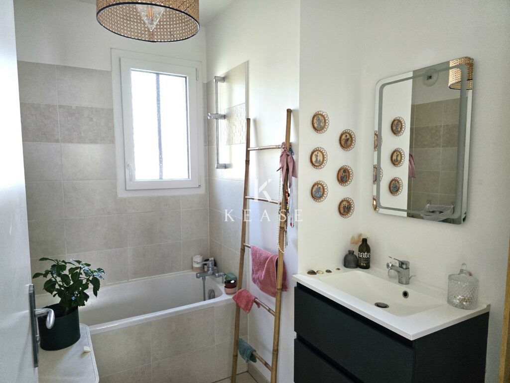 À l’étage, trois chambres avec rangements intégrés, une salle de bain équipée d’un miroir tactile éclairage intégré, et un WC séparé. La climatisation réversible apporte un vrai confort en toute saison.
