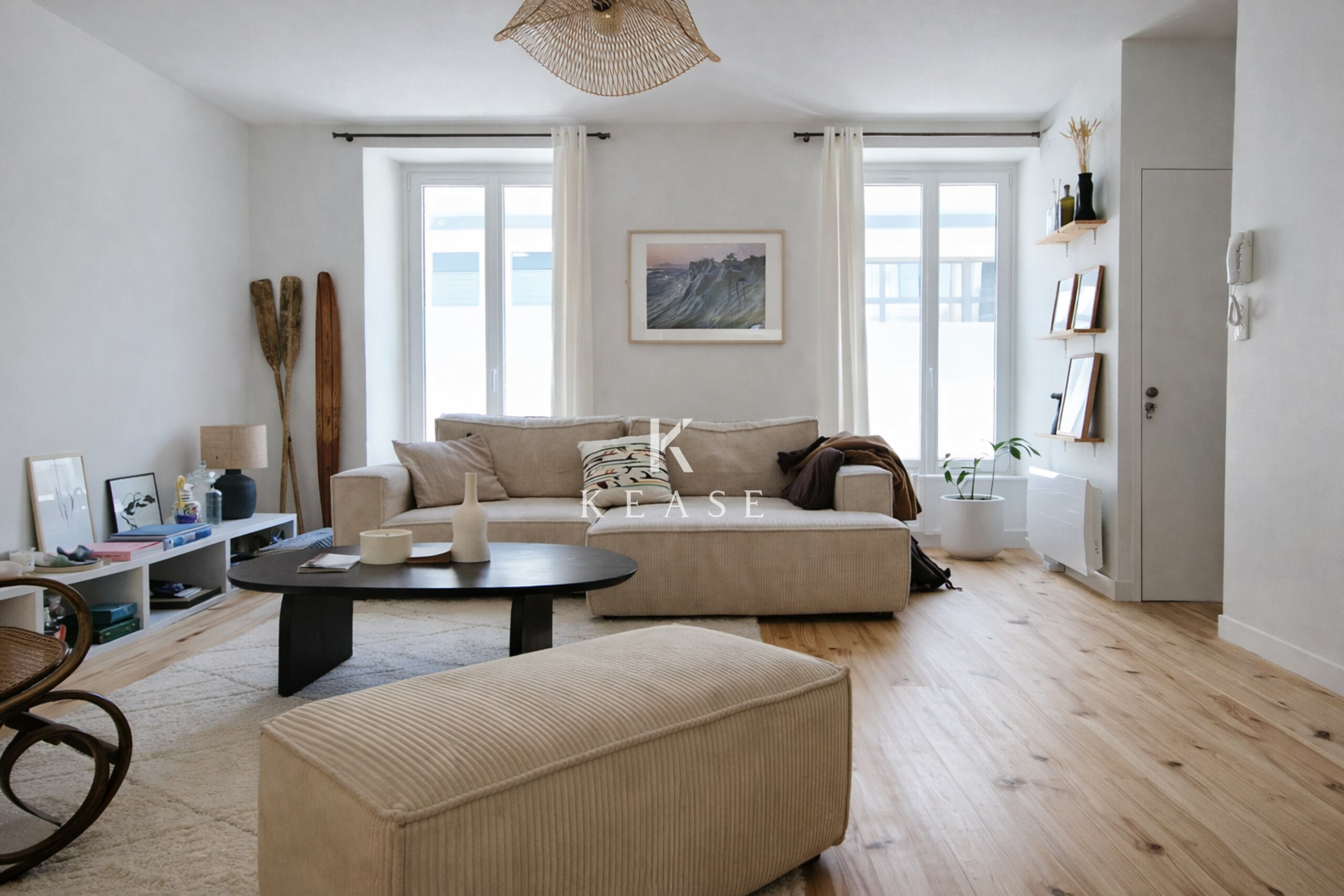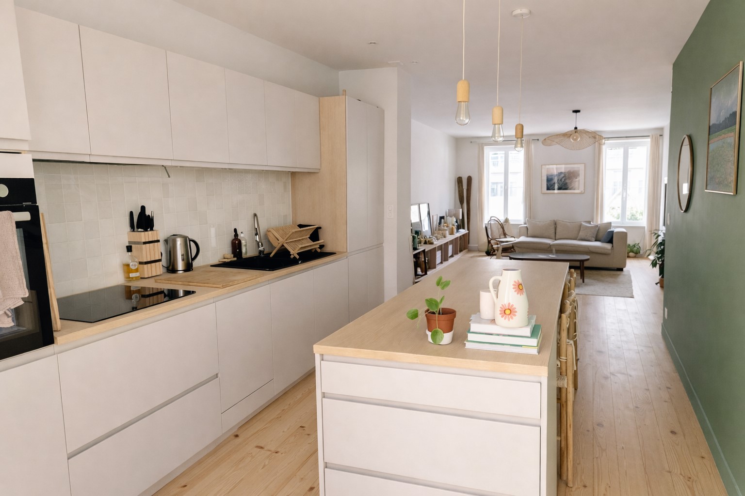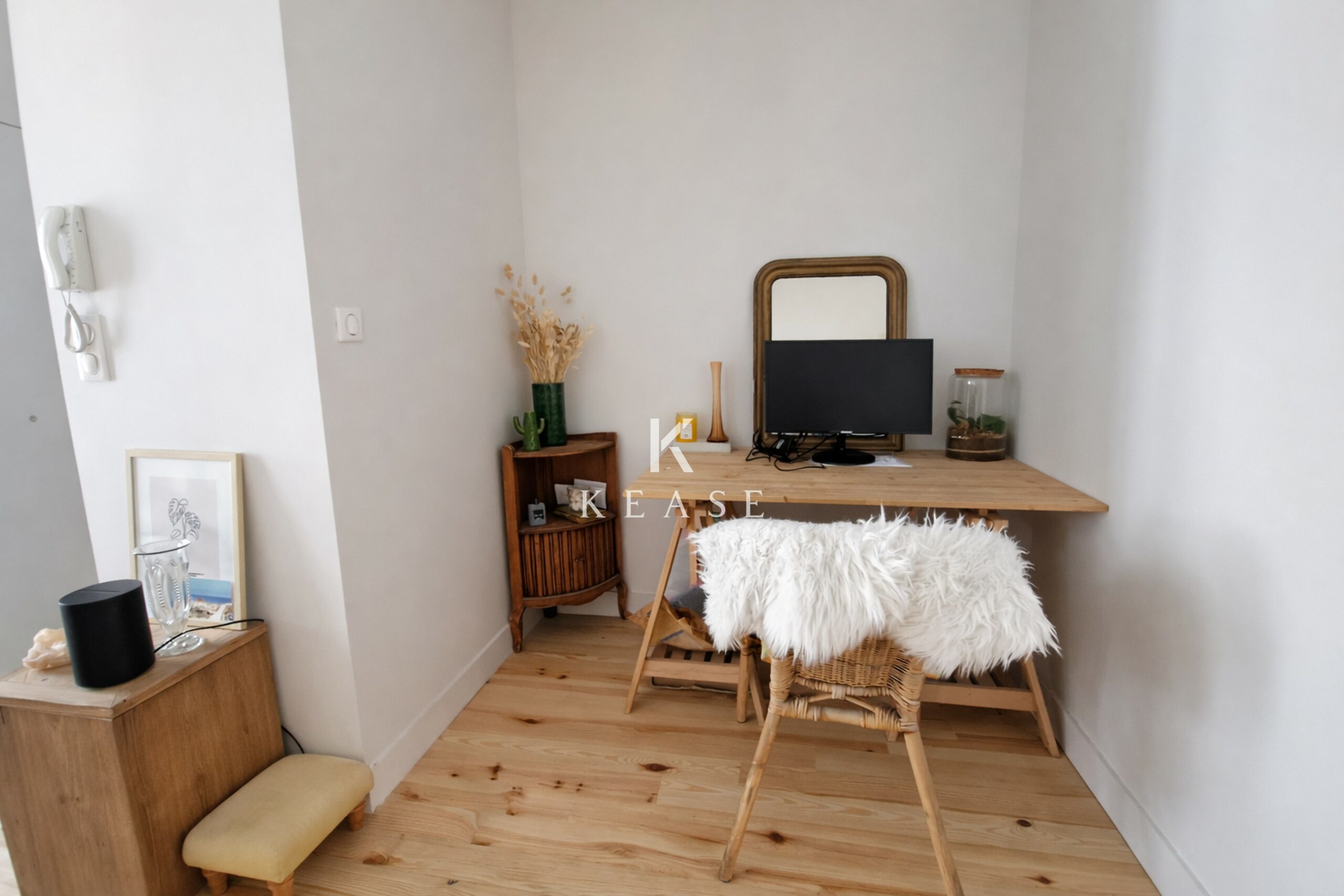 L’appartement propose une distribution fluide et agréable : une belle pièce de vie traversante, baignée de lumière, avec une cuisine ouverte aux lignes contemporaines, un espace bureau discret idéal pour le télétravail, ainsi qu’une chambre tournée vers l’extérieur, au calme, avec rangements et salle de douche attenante.